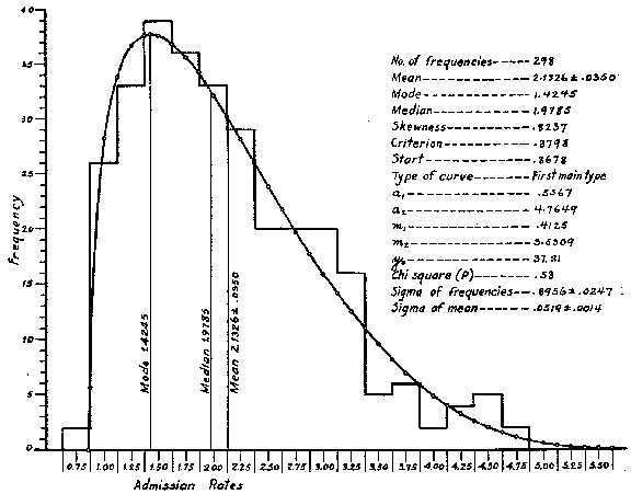 Histogram and fitted skew curve for daily admission rates from diseases and nonbattle injuries to hospital and quarters per 1,000 strength in 30 large camps in the United States during 1918, excluding September and October. |