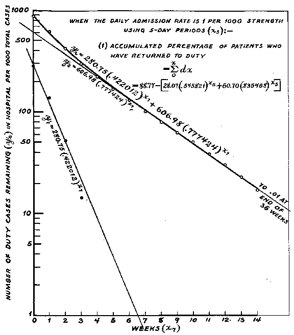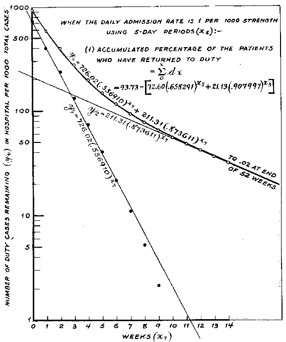 The accumulation in hospital to any day from the first to the tenth of patients who will return to duty or die on that day or before. Admission rate front each cause is 1.00 per day |