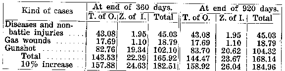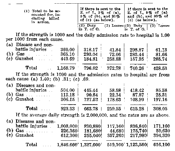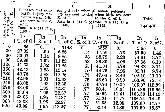 Disposition of gas casualties during the first 360 days of battle, when the daily admission rate from poisonous gases is 1.00 per 1000 Theater of Operations strength |