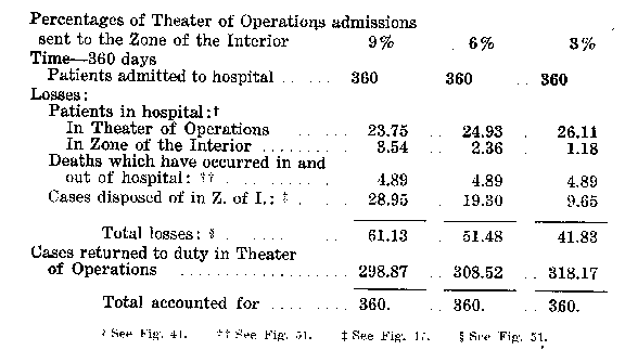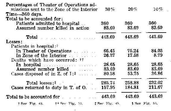 Number of Theater of Operations patients from diseases and nonbattle injuries in hospital in the Theater of Operations and Zone of the Interior, when certain percentages of the Theater of Operations admissions are sent to the Zone of the Interior. |