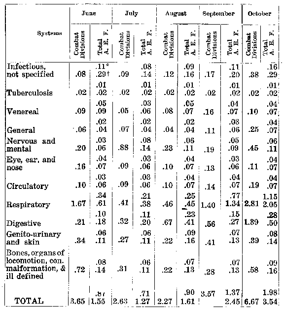 Daily admission rates from diseases by systems by months, among each 1000 white enlisted men in combat divisions and in the total American Expeditionary Forces, June to October, 1918 |