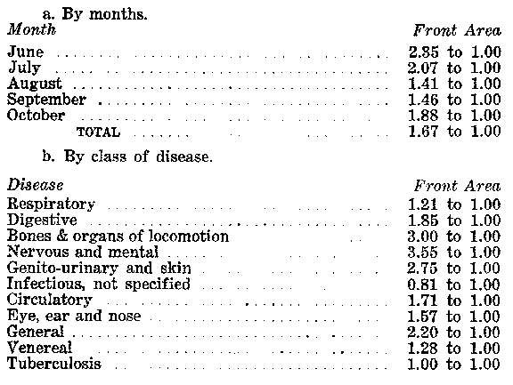 Relative number of cases of sickness among the front area troops as compared with the estimated total in the American Expeditionary Forces |