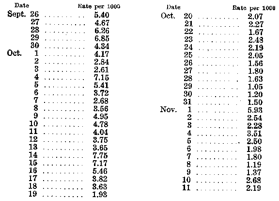 Daily admission rates from diseases per 1,000 strength of white troops in the front area, and in the total American Expeditionary Forces, for the period June 1st to October 31st, 1918, and also for each month of that period. |
