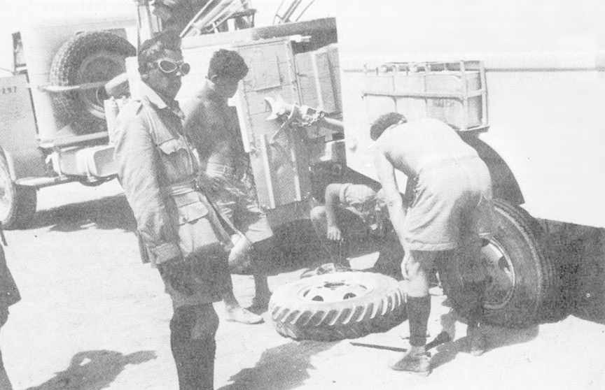 Moving from Sfax to Kairouan I was to take one of our officers up forward to pick out a spot. Thirty miles up the powder dust track, "Cherub" quit. Not by degrees, but just --- plop --- and she was through. We rolled off the track and I got out to look her over. I had picked the leeward side of the track unfortunately, and every truck that went past throw dust all over us. We waited for hours for our LFA workshop to catch up to us.