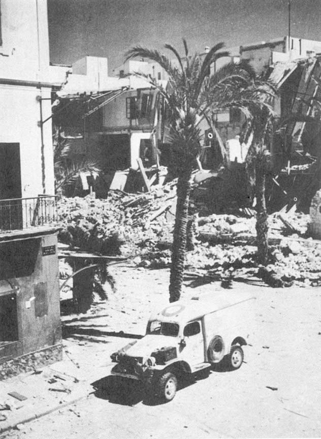 A smooth straight and empty road led into the city. Down it we raced at a speed I had not attempted since my civilian days. Sfax was lying on its back dazed by two conquests in one season, deflated by the sudden withdrawal of its bosses, a city in a faint. When we first saw it, there was no one on the streets but an occasional soldier standing guard at a vital intersection or local inhabitant auspiciously sniffing the new atmosphere. The physical aspect of the town told the story of the air war. The attacks of British and American planes had made a junk-heap of such objectives as the docks and railway station, and left scarcely a single building unmarred. We had time only for a passing glance at Sfax as we rolled through on our errand, but an hour later we returned to see a new Sfax.