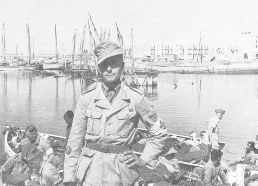 At a Tunisian port a German medical orderly (POW) helps load the wounded onto whale boats which take them out to hospital ships waiting in the harbor. photo by William Elmslie, AFS.