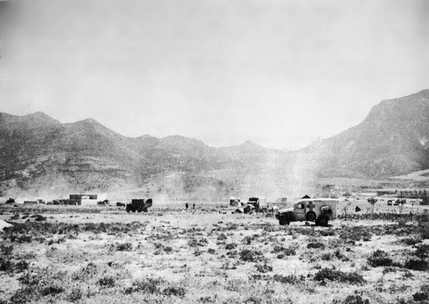 AFS with Indian Division on Cap Bon peninsula. Dust raised by Axis prisoners streaming down from Cap Bon to POW cage.