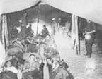 A group of wounded rest inside a dressing station tent after treatment. They will be evacuated back to a base hospital by A.F.S. ambulances. Photo by John O. Cobb, AFS.