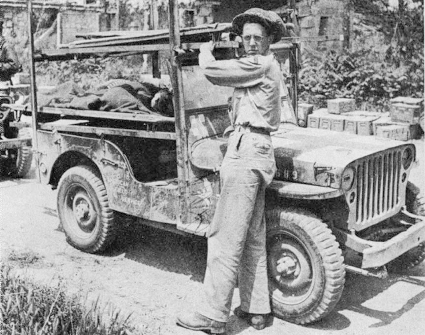 "The other day I had an upsetting, but amusing experience. I was carrying a corpse back in a jeep fitted with stretcher racks. The corpse was on my right on the top rack. I had no sooner started off when its arm swung down and slapped me on the head. Just grazing my ear. I tucked the arm up again but soon it whacked me once more. This was too much! I stopped and tied its hands together and from then on we had a very pleasant ant ride together!