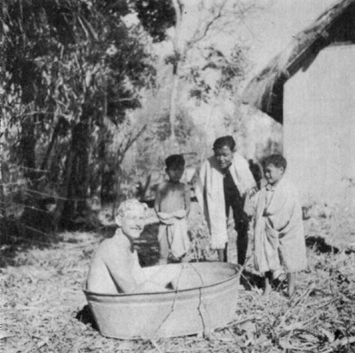 "In traveling around these outlying villages, still completely unspoiled, I am still peering around like a tourist fresh off a boat, not acting at all like the jaded old jungle-wallah that I should be now. The people are not to be confused with the weird little primates not yet above a bit of head hunting, that run about in beads and loin cloths with spears. In the clay compounds, between the huts, are looms and wool spinners and grain mashers and people always working on them. The children are beautiful tho often pot-gutted. Usually naked, and the girls, much too old for that sort of thing, sport a shirt and headcloth. One taking a bath (in a great brass pot) will cover her face, if you look her way, ostrichwise.