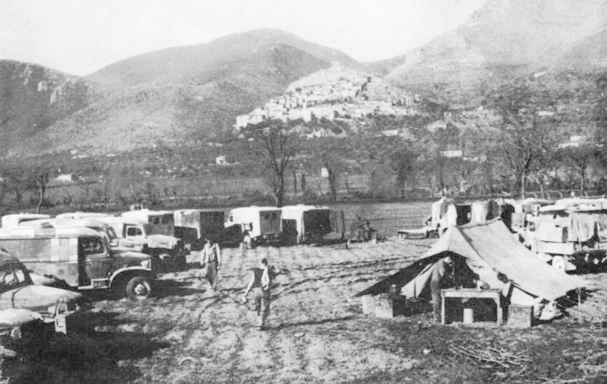 An AFS ambulance car pool behind the Fifth Army front. The GHQ of the Army was located at the left of the town of Presenzano (center of photo). These are the AFS vehicles which participated in the Cassino battle. They are shown above, waiting assignment at the AFS headquarters about 15 miles behind the town of Cassino.