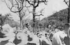 "There are wild orchids and gardenias growing around and great quantities of some little purple bush flowers that sometimes cover a whole tree. Banana trees and bamboo clumps have a line appeal that one would never see in America except perhaps in poplars. The most interesting are these huge banyan trees on symmetrical little hills out in the green and grey rice paddies. They look, except close to, like huge elm trees but their branches have trick of coiling back to the ground and taking root. Thus the area that one of these old trees can encompass is practically endless; some look like small forests, and there is little way of telling which is the main trunk. Some trees have little cairns and written on cloth before them where road is placed for the Nat who is some sort of spirit that is in residence within.