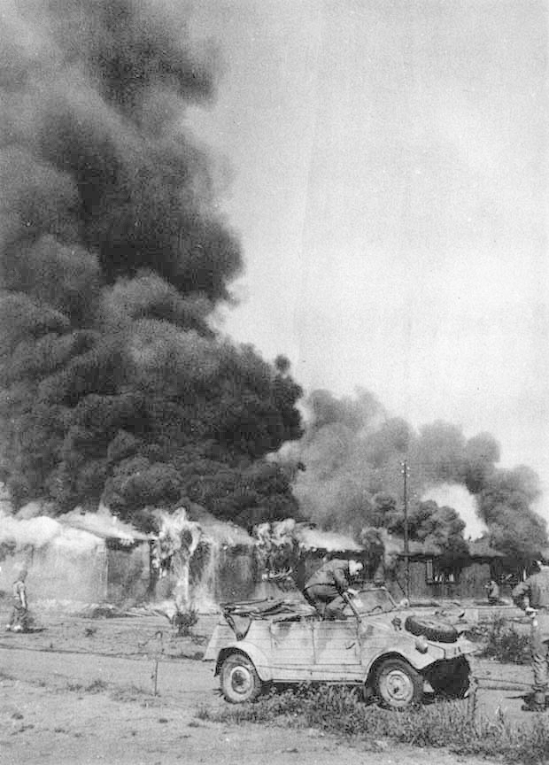 The end of Belsen. The infamous Nazi camp set afire by the British