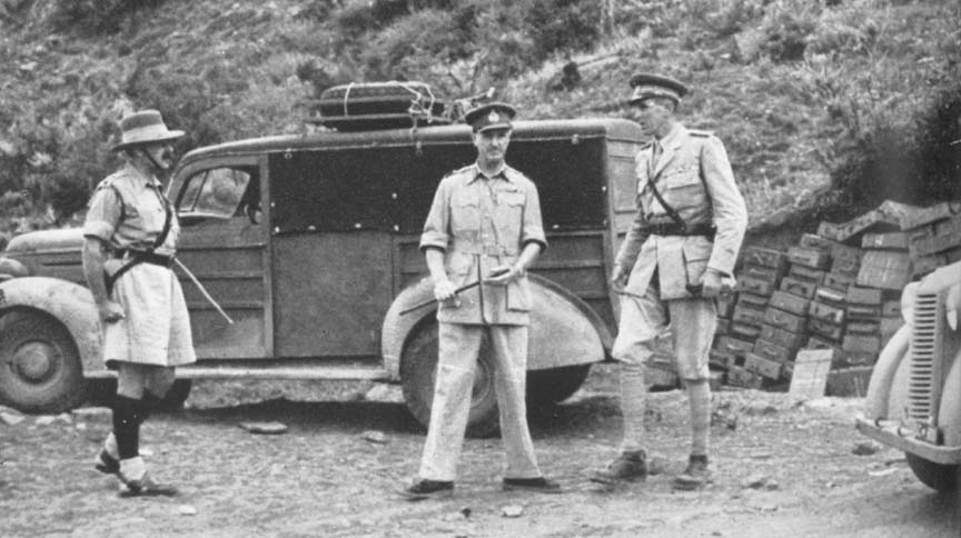 MILESTONE 109 ON THE KOHIMA-IMPHAL ROAD: MAJOR-GENERAL GROVER, BRIGADIER SALOMONS, LIEUT-GENERAL STOPFORD, BRIGADIER SMITH |