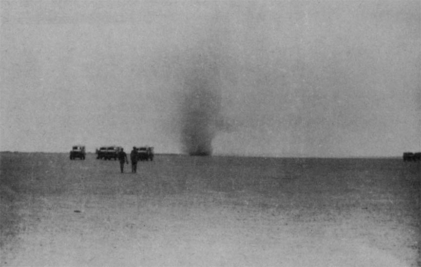 We stood rimming the edges of our hurrying trucks. Our eyes were being opened and filled with the new wonders of this strange land into which we had been dropped. On our right was the Suez Canal. In the distance to our left rose a rugged, barren escarpment. The white-washed sand and a few oases of fig palms in a continual panorama unrolled before us and then faded into the distance behind. We passed Arabs walking along the road, a new people to us, and their sandalled or bare feet, their long flowing robes, their turbaned heads denoted a new way of life which we were to see and know for so long. An almost unbreathabiy hot wind seared our faces.