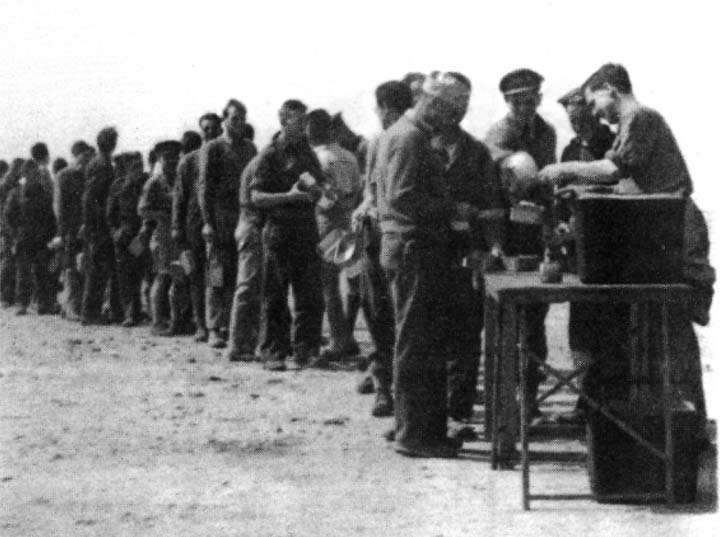 There was mush and fried bread for breakfast, cheese snacks at lunch, always plenty of tea --- and flies. When at HQ or in convoy, we formed queues in orderly British fashion, as our faithful cooks --- often a "Curly" or a "Lofty" --- dished out their offerings.