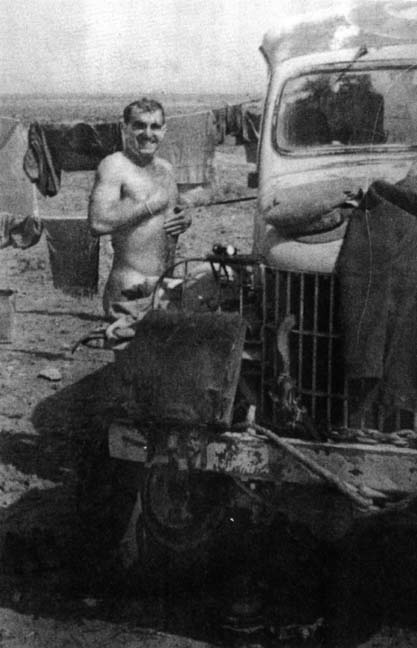 Keeping ourselves, our uniforms, and our ambulance "home on wheels" clean and in good repair in desert conditions in mid-winter was not easy. Winds churned up the sand, and often exposed gritty and dusty hardpan which ground its way everywhere. Cleaning the engine, tending to grease points and changing oil meant soiled hands, sweaty bodies, dirty clothes. Inevitably buttons came off and fabrics were torn. With a ration of water limited to two quarts a day per person, a bath or shower was out of the question, and our capacity to improvise was challenged. We made use of petrol to rinse away grime; we recycled radiator water for washing, using petrol-soaked sand to heat the water. I wrote about this in a letter home dated March 4: