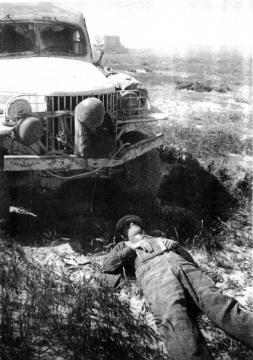 The road or track proved little better than the others, in spite of the fact that it was on the map. I had to drive very slowly, inching my way along and trying to cheer the wounded man as best I could. There were deep shell holes along the way, causing me to detour through sand. The shells had found their mark, for scattered about each hole were bits of vehicles, charred and mangled. Shreds of clothing also lined the road and even the rocks were burned.