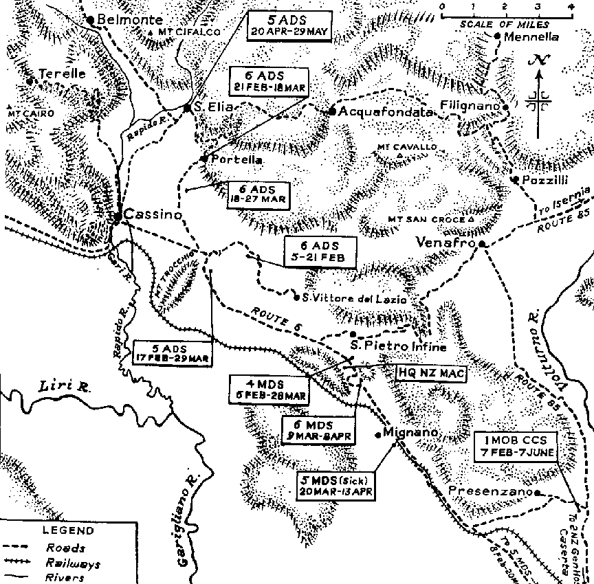 The ADSs and the MDS, as well as the large concentration of troops in the forward area ready to attack when the weather improved, were within enemy shelling range. At 6 ADS about five o'clock one afternoon, fifty-odd faces were lifted from fifty-odd mess tins at a sudden, uncomfortably close, screeching of shells and a series of explosions and clouds of dust along the embankment and beyond. Most of the shells landed in the 25 Battalion lines, wounding a number of men. A few minutes later the casualties were arriving at the ADS reception tarpaulin. They were evacuated to 4 MDS and later taken by the NZ Section MAC to 1 Mobile CCS which, under Lt-Col Button, had opened at Presenzano. Sickness cases were sent to 5 MDS, set up by Lt-Col R. A. Elliott on Route 6, near the Venafro turn-off.