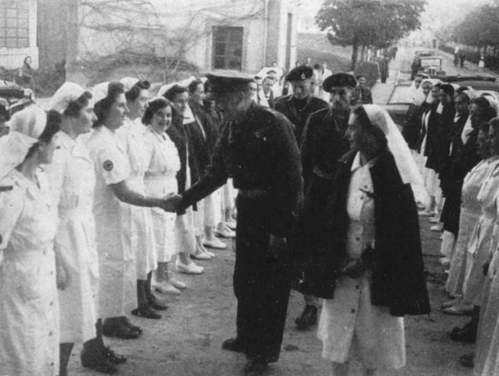 Freyberg (with Matron Miss J. MacKinnon) shaking hands with members of the