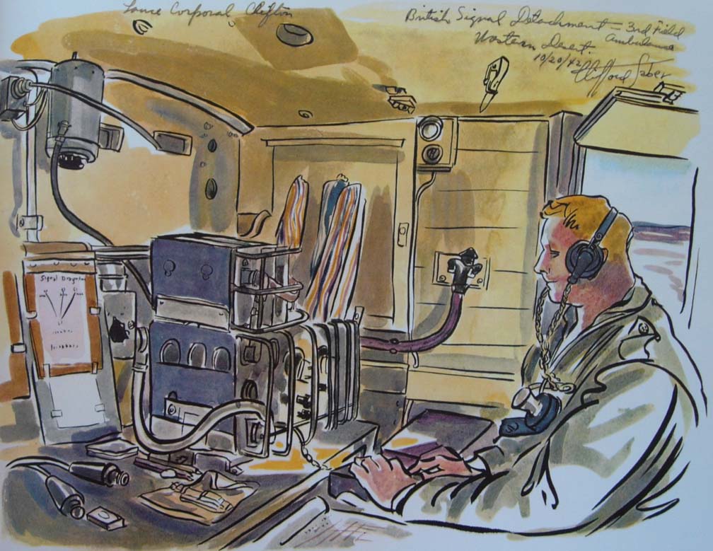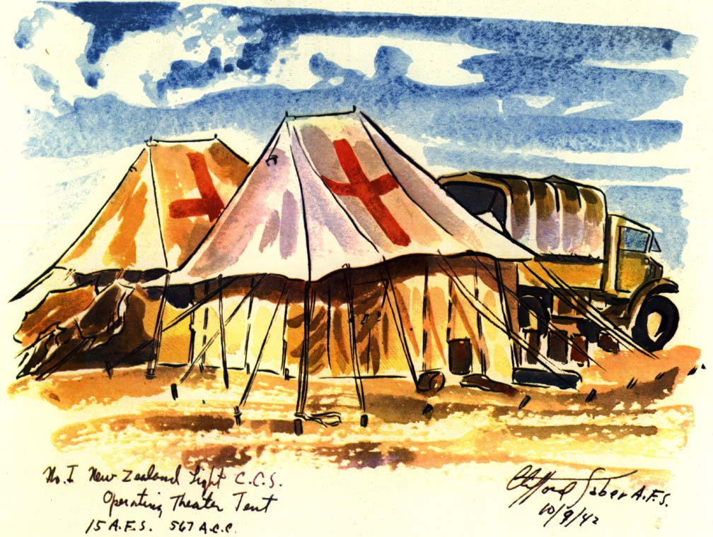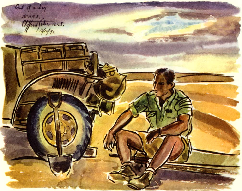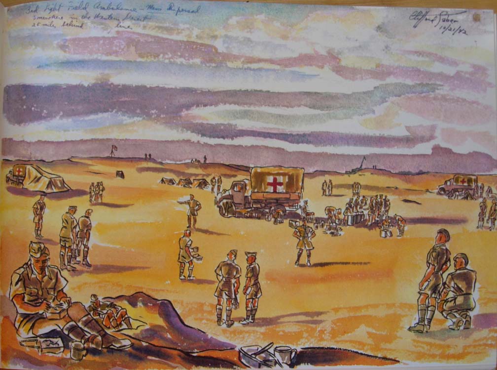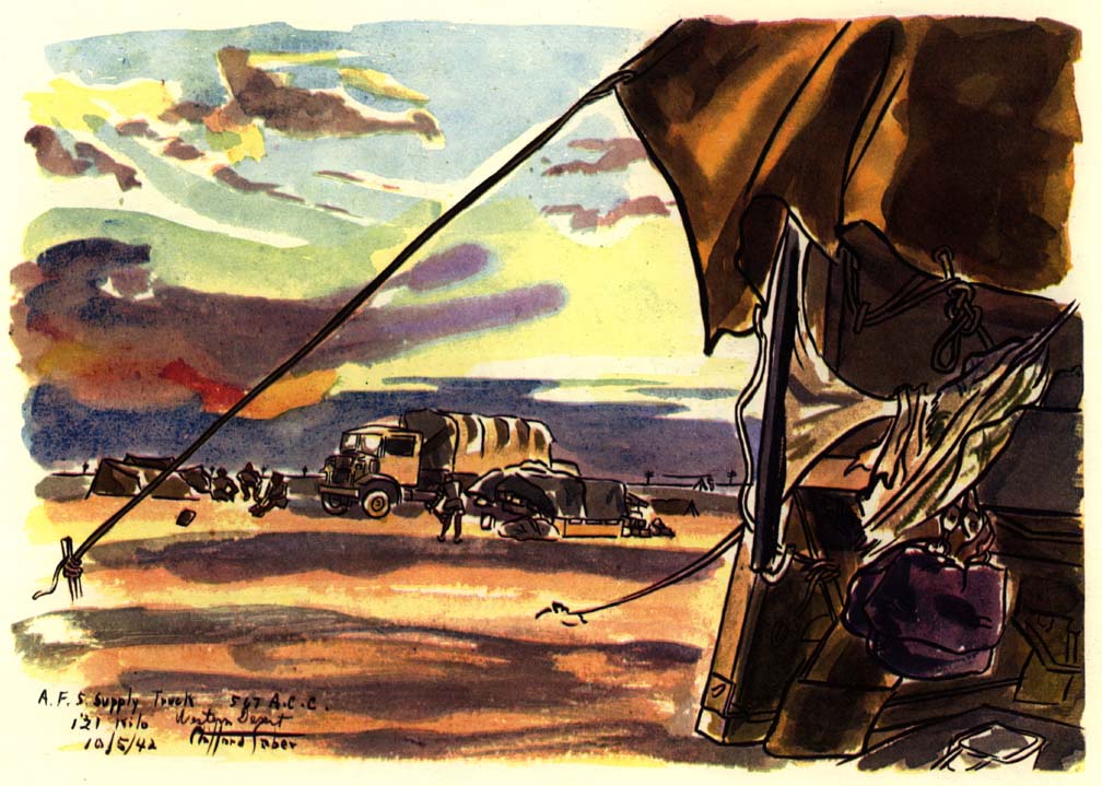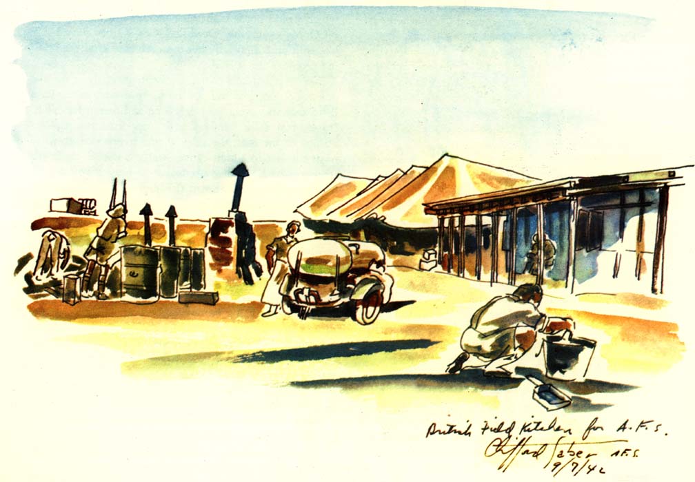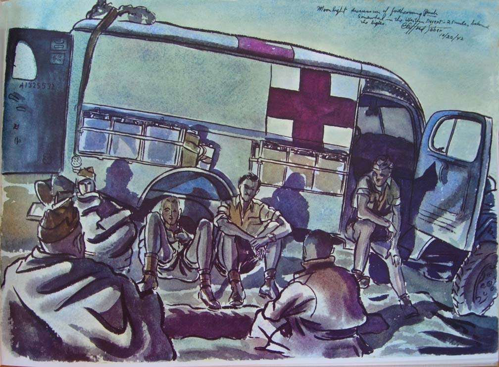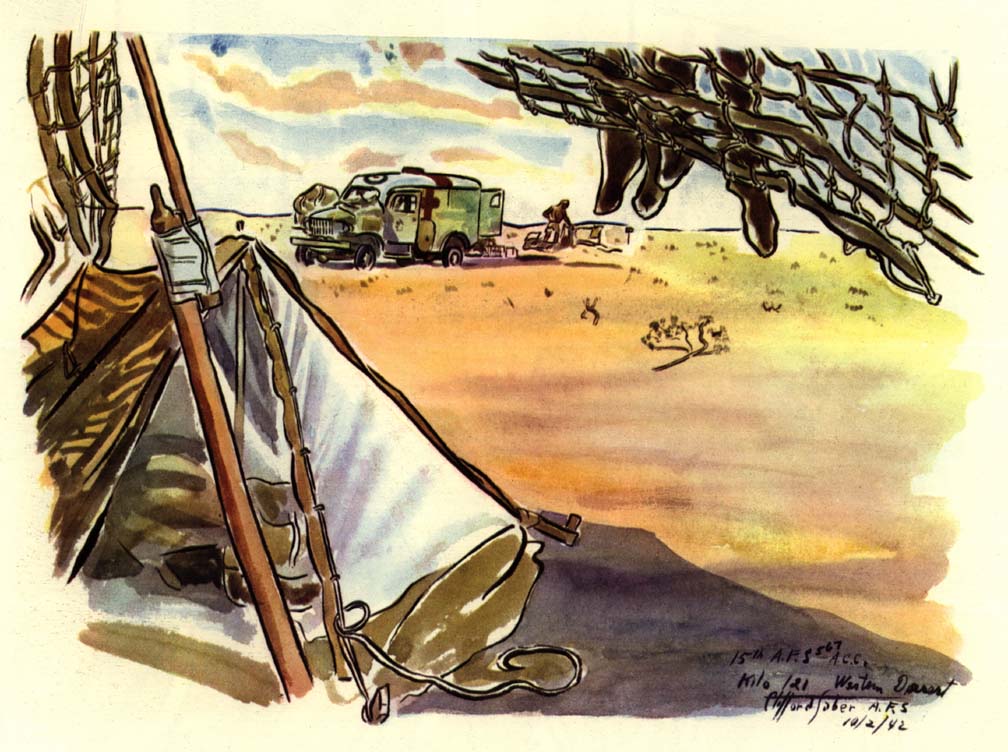 Late in the afternoon we found the company leaguered off the road at a point known as Kilo 121 which became our camp site for the next three weeks. The area was clean and of soft sand. The cooks had set up their kitchen. Swill pits and latrines had been dug and desert roses (two four-gallon tins planted in a sand hole for a urinal) were marked. Workshop trucks had been set up and camouflaged. As the ambulances were dispersed, I found myself as Hazy's spare driver, living in his ambulance in the suburbs away from the center of camp, a good half-mile walk to mess and a longer walk for subject matter to paint.