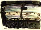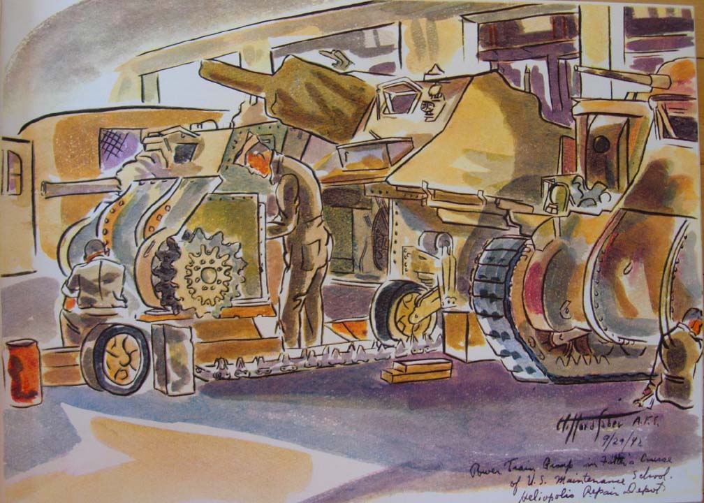 Since I still had free time before joining my outfit which was on its way to the Western Desert, I sketched the American tank-maintenance depot at Heliopolis for the army and OWI. The latter lacked an American art director at the time and was expecting one en route from the States momentarily. I retained two of the paintings and the rest were used for promotional purposes.