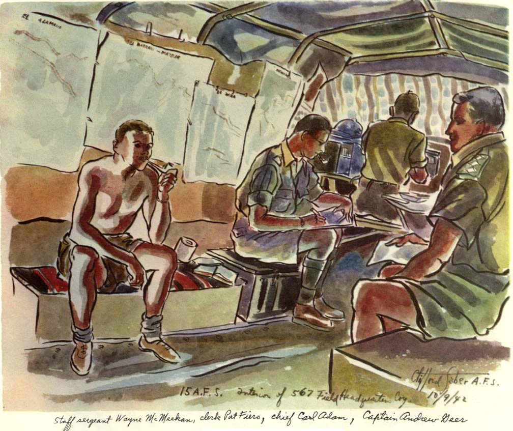 Being Major Benson's aide-de-camp, I picked a tent at random to store my home-bought gear before reporting to him for leave in order to put the finishing touches on my painted, captioned convoy sketches, to arrange their shipment to the States, and to get on with my proposed meeting with Collier's war correspondent Frank Gervasi in Cairo. Major Benson was in a conference with Captain Geer, Captain Hinricks, Grafton Fay, and James Ramsay Ullman. The last three were convoy unit leaders who relinquished their command upon arrival in Egypt.