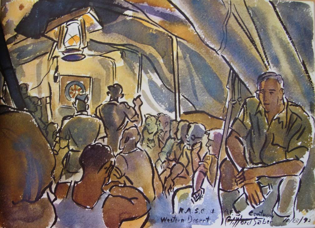 It had got dark by the time we sauntered into the crowded, dust-covered social MOB (mobilization center) tent of the 8th Army. The air was stale and heavy with smoke. An artist's storehouse is his memory. My mind was stocking up pictorial material as fast as a calculating machine. I severed myself from the personal conversation and just looked.