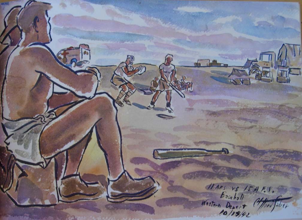 11th Company challenged the "Chickens" to a series of baseball games. The competition included British personnel of both companies. With Whitey, Baron, and a couple of cooks, we won six games out of ten. We won four straight games, coming from behind in the last two. In the last game, in the last inning we scored four runs to win. While we were at bat, I did a quick color sketch of the game and then went out to left field to catch fly balls.