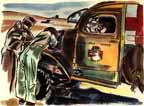 With the exception of the lead car, each driver in convoy was guided by the car ahead. At night driving was extremely tricky. Your range of vision was about thirty yards although you could distinguish the horizon which was miles away. Because of this, the car ahead seemed habitually to drop completely out of sight even on a fairly level stretch. Traveling in a straight line meant that you went through desert obstacles without being prepared for them. Slowing down, speeding up, or shifting gears, you kept the car ahead in sight, which was no easy task, especially when it ran into loose sand and slowed down. After it pulled through, it would speed through the night to catch up to the convoy, while you were left in the sand. In order to overtake it, it was your turn to step on the gas, leaving somebody else cussing behind you to shift for himself. However, nobody was ever really lost for he usually had a low star sighted to drive by when outdistanced by the car ahead.