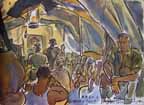 Inside a canteen tent, a hooded light threw a dim glow over a scramble of pushing men dusty from head to foot. The place was crowded and the air was stale and heavy with smoke. Static distorted a broadcast of music from home, coming from a radio you couldn't see. You squeezed in and edged your way toward your own group which was chatting noisily. If you were lucky, you grabbed yourself an upended box or petrol tin for a seat; otherwise you stood, drank beer, and watched a dart game. The canteen meant relaxation, news from home, and luxury, for you could purchase unusual supplies of canned food, liquor, and the most precious of all --- cigarettes of every breed, shape, and description. With a few beers under my belt, I painted such a scene by chance. The light was so dim I couldn't see my paints. Someone produced a flashlight and held it over my shoulder long enough for its limited light to allow me to complete the fast sketch.