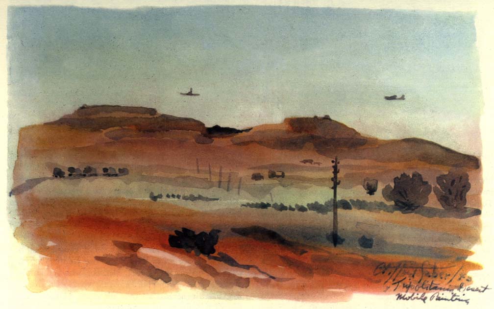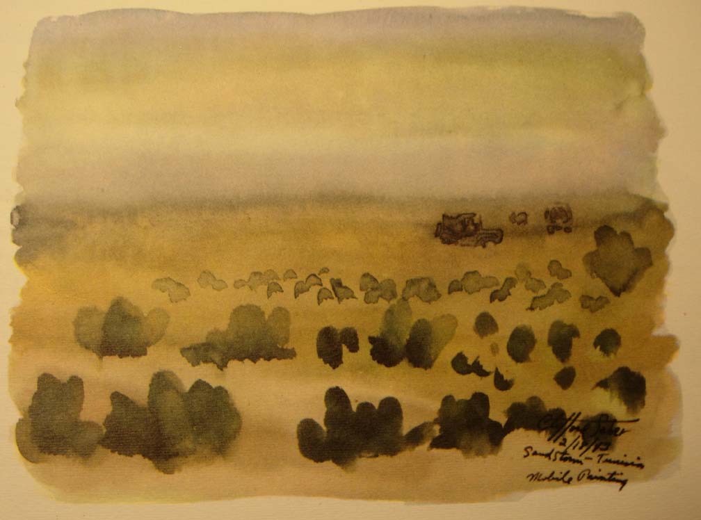 In convoy, while we plowed through a sandstorm, Wee Wee took over the wheel and gave me the opportunity while the light lasted to paint various phases of the storm on the move. We were entering enemy territory where the LRDG's had just made a reconnaissance. They had reported to Montgomery, giving him valuable information for his plan for the battle of the Mareth Line. We had the strange feeling that the eyes of 88 mm's were looking down on us from the Matmata Mountains on our left. We were never really scared when we were actually being shelled, bombed, or machine gunned, for we were too busy working, and then too you weren't alone, for no matter where you looked you saw other units and men close by. Now we were alone, going toward a spot where a month later the New Zealand Division with some 27,000 men and 200 tanks were to overcome the difficult terrain and enemy action by outflanking the Mareth Line to Hamma. As a lone moving brigade, with the thought of Jerry surrounding us, we became more uneasy the farther we penetrated his territory. The khamseen camouflaged us from the enemy but its intensity hid us from each other as well, and it was a job for Wee Wee to keep the ambulance ahead of us in sight.