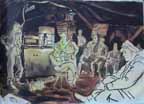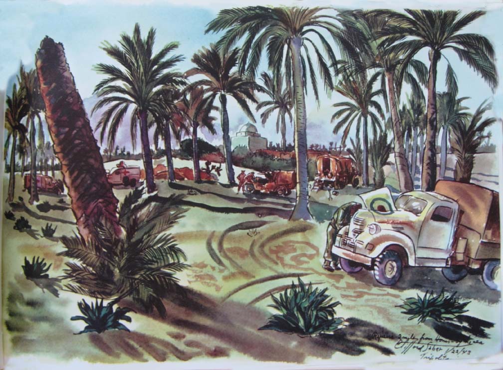 Our chance meeting on the desert with the guerrilla group was rare in a battle area. It was short and full of inquiries and not conducive to sketching. It was one of those times when our MDS of the 14th LFA was ahead of itself and its brigade and a month ahead of Montgomery's flanking movement at the Mareth Line. Also up in the surrounding Atlas Mountains Jerry's 88 mm's were looking down on us.