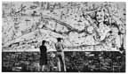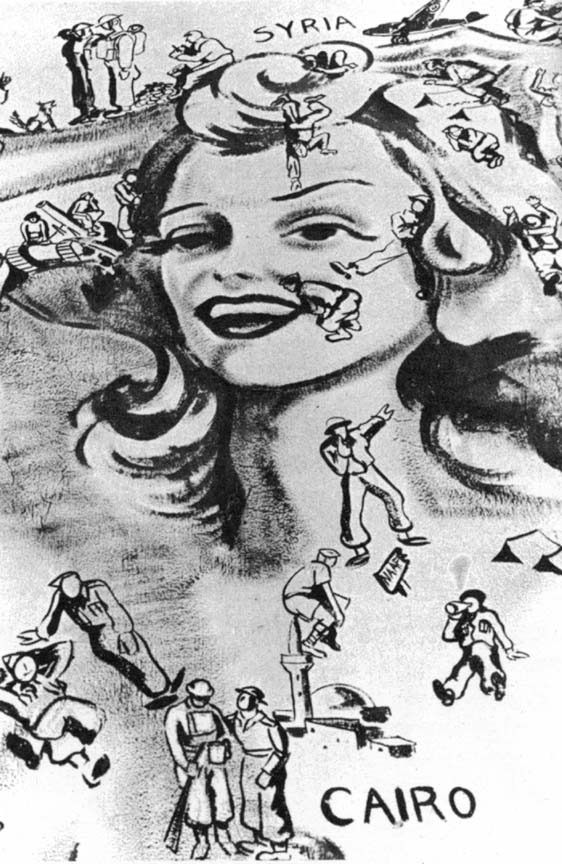 For the recreation room at Garian, I decided upon a super-duper nude encompassing the entire wall, 30 x 15 feet. Usually when a muralist works he uses a scale pattern of a small sketch or a photograph of the sketch projected onto the wall. He carefully traces this, insuring his proportions. In this case I had neither the time to make this sketch nor the means of projecting it. And to top it all - no scaffolding. I managed to get up by means of boxes, but this meant that my nose was rarely more than six inches away from the wall. Starting from the head, I worked down to the feet on this beautiful virgin wall. To this day I don't know how I kept the figure in proportion. When I stood back to inspect the completed figure, I found that the top outline of her body ironically coincided with the coastal line of North Africa. I marked her off as the Middle East from Tripoli (Lebanon) to Tripoli (Libya) and named parts of her body for nonexistent wadis: Wadi you hiding? Wadi you doing? Wadi you say? Wadi you know? Superimposed on her from Syria to Tunis were Lilliputian figures of the units, men, and doings of the 8th Army. Somewhere near the midriff is a blown-out German tank with the string of old boots tied behind and a caption on the back, "Just Married." Above her soared the RAF and American 9th Air Force whose eager men were parachuting onto her. Along with the confusion of armored cars, convoys, and slit-trench digging on her terrain was a key figure similar to the Kilroy of the U.S. Army. It was a little Tommy in a sitting position holding the inevitable stretched-out newspaper and shovel. He was among the parachutists, the infantry, the armored units, and even at chow call. Such was life in the desert.