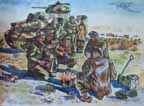 The gun itself certainly had had an interesting history, a taste of which I got that afternoon. It had seen service in France, during Wavell's Push, in the siege of Tobruck, and in the entire Western Desert campaign. Its crew was wiped out three times, once by shell fire, once by bombing, and once by machine-gun fire. Once when the gun was disabled and the crew casualties, Sergeant Owen moved the wounded back and pulled the gun away from a burning ammunition lorry. At the time I did the picture, which had a suède finish from the dust storm, he was up for a military medal. He was truly a Desert Rat.