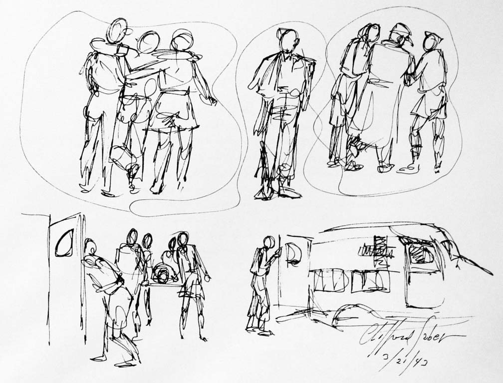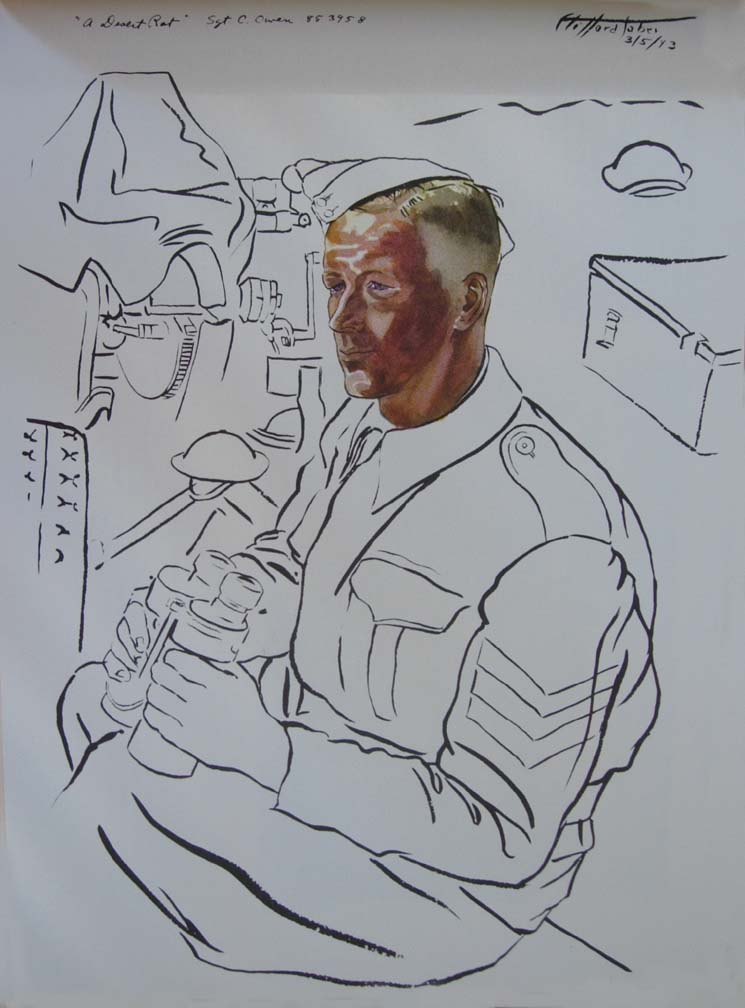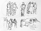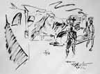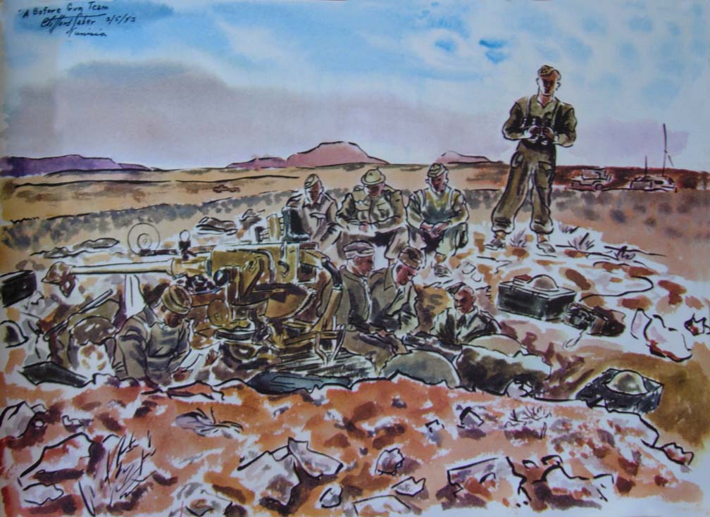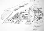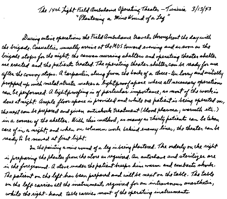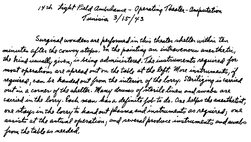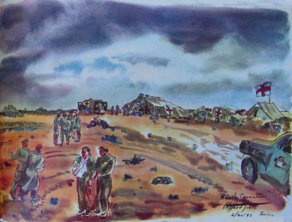 As the main attack began, Wee Wee and I were hastily recalled from the ADS of the 14th LFA at Foum Tatahouine to a car pool servicing the Northumbrian Division and other divisions along the line. When we arrived our guns were sending over a tremendous barrage with a continuous roar from a hundred shells. As they quieted down Jerry retaliated with his artillery, and it was almost as fierce as ours. This was Alamein all over again with our eighteen bombers going over and the wounded pouring in; and we ourselves were on the go, working without a letup. As I waited for patients I hen-scratched sketches on the run. The battle wasn't as one-sided as Alamein had been; the line was hard to crack. The 50th Division secured its objectives protected by barbed wire against cross fire from the flanks. The casualties were heavy and we worked more steadily than we had in Egypt. Some tanks succeeded in crossing the wadi and their losses were considerable. Sappers had difficulty clearing paths for vehicles. More and more casualties kept coming in and we went on working with no sleep.