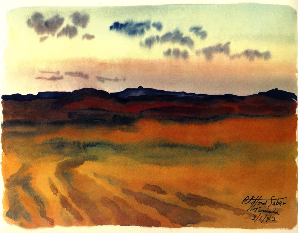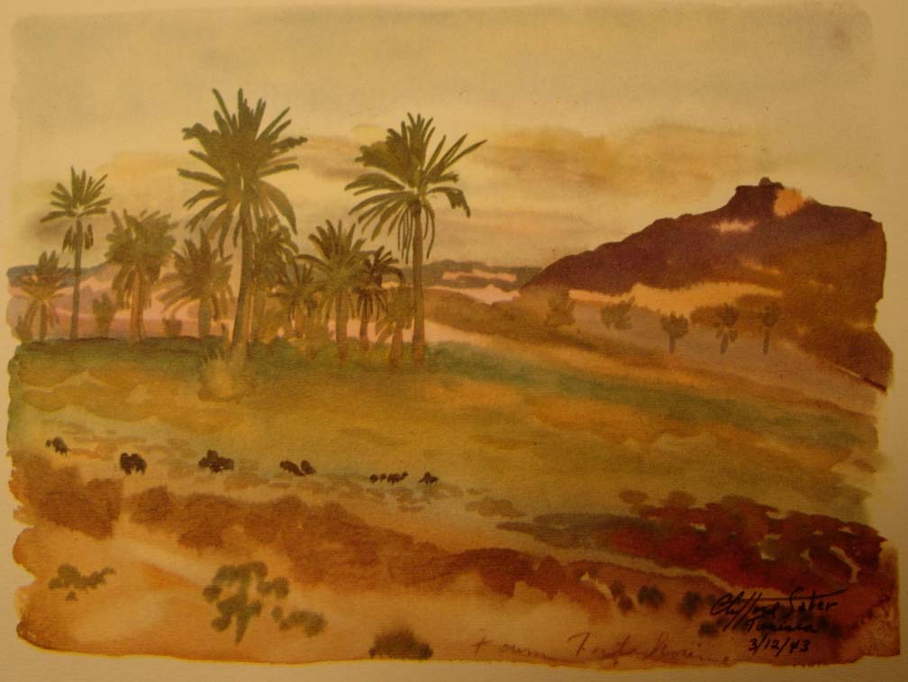 AT FOUM TATAHOUINE, where an old Arab fort commands the pass, we came across fields of beautiful flowers instead of flat dull featureless desert. The flourishing palm trees and mountain ranges were very reminiscent of California. Although they looked serene and majestic, death lurked in them and the noses of 88's were ever haunting and looking down.