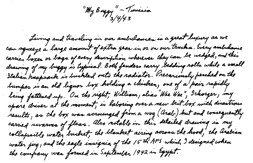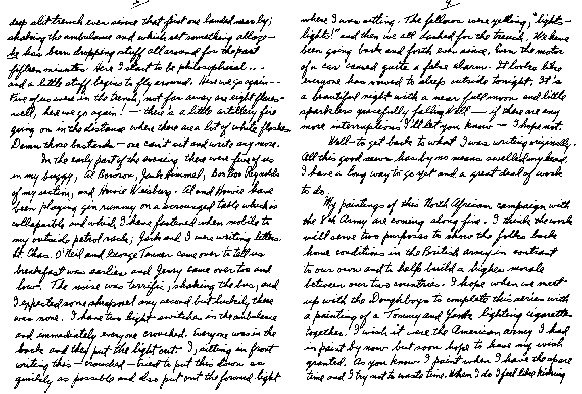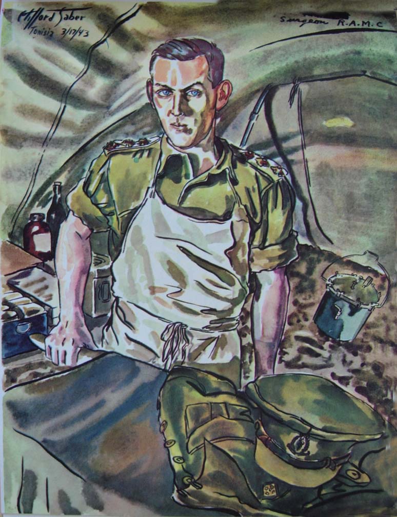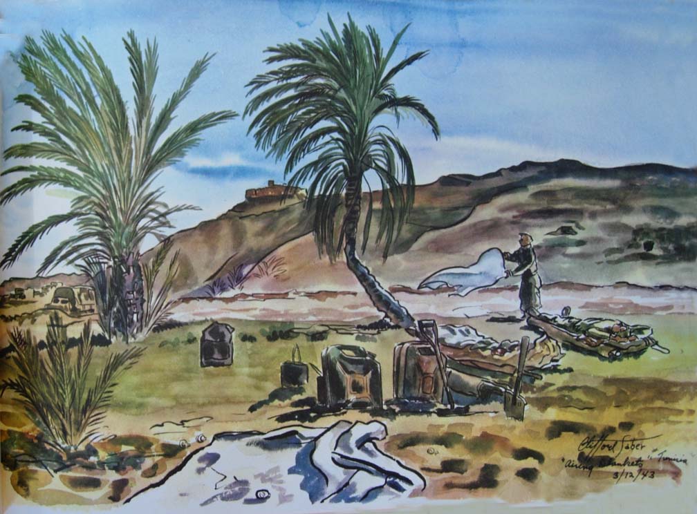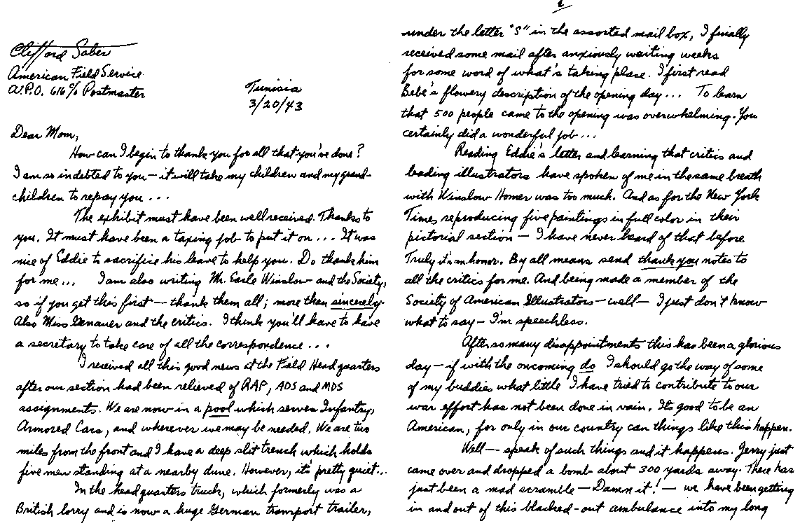 Clifford Saber Dear Mom: Thanks to Mr, Henry H. West, of General Motors, and his kind secretary, Ninio, the latter taking down this letter in shorthand and typing it for me. I am finally able to send a letter off to you. I would have written you sooner, only I had what is known as "diplopia," which is double vision. I've wanted to write ever since I got into the hospital. I think I worried more about not being able to write you than about my illness. However, I hope this will clear up a lot of things you have wondered about. We were out in the blue, on a 72-hour duty without a letup. I had been driving and evacuating patients all day and night. It was two o'clock in the morning when Wee Wee took over the wheel. We were returning to the MDS to pick up wounded. It was a beautiful night when out of nowhere appeared this huge bomber. It looked as though it were perched up on the crest of the hill on the road ahead of us. I thought it was one of our planes, until Wee Wee yelled, "Watch out for the rear gunner!" I saw the flash of the gun and felt the bullet hit me. At first I thought I was grazed, and Wee Wee gave me the impression that I had been. I guess he didn't want to alarm me. As soon as I was hit, everything turned red, and I had the sensation that someone had poured a bucket of hot lava over my head which started to envelope my entire body. I tried to say something to Wee Wee but my voice just did not seem to come out. My lips moved but there was no utterance. In endeavoring to move, I discovered that my left arm and leg were paralyzed. Wee Wee immediately stopped the car and yelled to Al Bowron, who was returning behind us. He drove up alongside, and they both bandaged me up and rushed me to the MDS.. Throughout all this I was conscious. As a matter of fact, just before I was hit Wee Wee and I were singing "Worried Mind." And even as they were rushing me back to the MDS and I lay on the stretcher inside the ambulance, I managed to sing a few bars of the tune. Al and Wee Wee's split-second timing in bandaging me and rushing me to the MDS I think helped save my life. I do not remember very much about my arrival, except seeing some of the boys; but hours later I remember awakening in the operating room and listening to the surgeon speaking to the nurse as he was operating on my head. I had a local anesthetic which was injected at the base of my skull. I spoke to him and he told me I had a large hole in my head and that the right side of my brain was injured. I think he worked all night on me: 7 hours. As he was tinkering with my skull it felt and sounded like someone opening oysters. He assured me that I would be all right, and noticing my restlessness, said that he had done so many operations that he could do this blindfolded. I was evacuated and flown down the line to a base hospital. I thought the plane ride was actually worse than being shot, as it was not one of our big transport planes. From this base hospital I was flown back to where I am now. Until a few weeks ago, my head was encased in a plaster cast. My wound is healing quite well, and the paralysis of my left arm and leg is gradually wearing off. I am even walking around now, although the sensation in my arm and leg is as if I were wearing gloves and six pairs of stockings. My double vision is clearing up and in a week's time I hope to have some glasses which will enable me to begin painting again. Don't worry about me, for I hope to be with you again soon. All my love, Clifford |