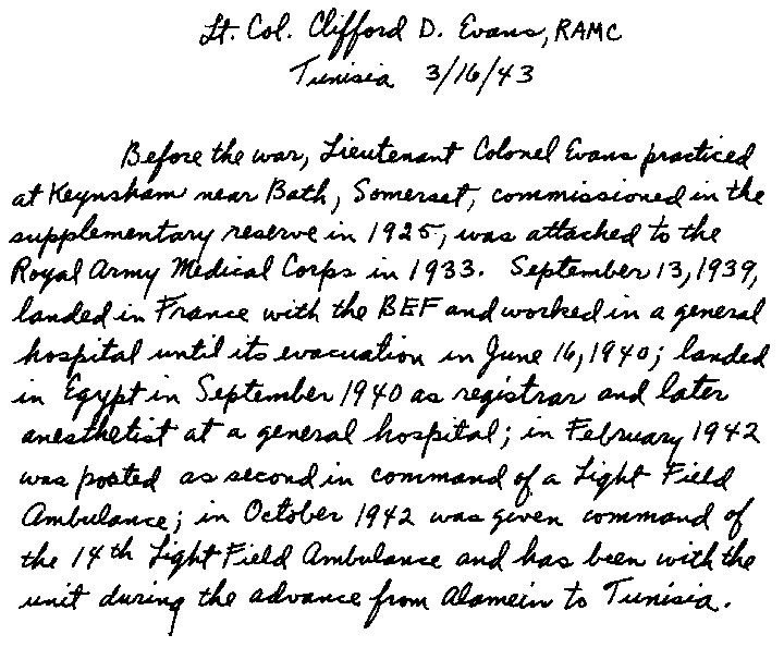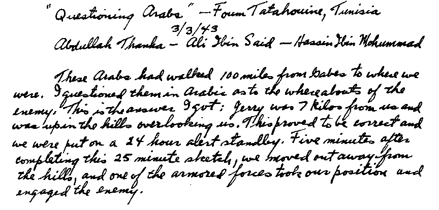 At one point we remained stationary at a place about 3 kilos from a small town. I was asked by Colonel Evans to see if I could get some French bread which we heard was on sale in the town. Also I was asked to inquire if there was a chemist's shop or drugstore which developed and printed films. I questioned the Tunisian Arabs, and they told me the way to the baker's where I learned that I had to have a formal chit from the French commandant to buy bread. This I didn't get, for bread was rationed and taking advantage of our military authority would have deprived the townspeople of this vital commodity. Also a false rumor had spread that their bread was being issued to our troops. But this pertained to only a few loaves that had been given to a patrol unit that had arrived there in pursuit of the retreating Jerry.