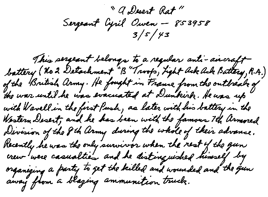 Later we learned that through all this maneuvering we had been cut off from our main outfit, the 7th Armoured Division, and as with the experience of coming out of an accident, the shock of what had transpired set in. It was an uncanny feeling for we had been unaware of our predicament. If we had known that we were encircled, I often wonder what the reactions would have been for we were a group of men accustomed to the sight and company of other units. We had a brief mental taste of what the LRDG's had been going through during the entire desert campaign.