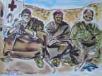 I started a quick sketch of them, drawing directly with a brush, a thing I rarely did in my larger drawings. Usually I first blocked out my design lightly in pencil, then drew with ink. This was done mainly to avoid errors and wasting hard-to-get paper. While sketching these three, I learned from them that Jerry was just over the hill a few kilos away. No sooner had I learned this than, right in the middle of the sketch, the Tiggy corroborated their reconnaissance and we were on the move again. In order to pack and get away, I finished the picture in such a rush that I drew the cane Abdullah was carrying right through the crossing lines of his abeyah.