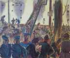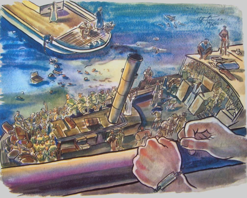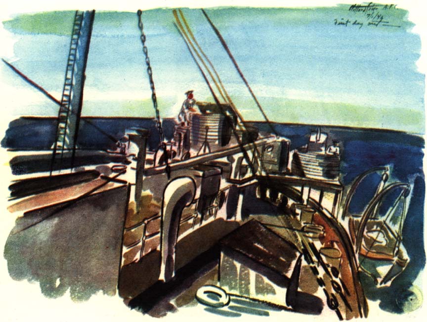 At the office of Bill Chessman, art editor for Collier's magazine, I met Frank Gervasi, a war correspondent who had successfully covered the Italian African campaigns and Il Duce's exploits. The meeting was arranged by a former art editor of Collier's, Major Stuart Benson of the Field Service, whose aide-de-camp I later became while on board ship. It was decided that I would do a series of paintings of the convoy en route and that I would contact either Gervasi or Quentin Reynolds, whichever one was in Cairo when I arrived.