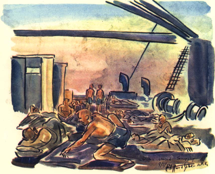 We continued northward and through the Red Sea where the weather became unmercifully hot. The ship had 6,000 aboard and we were twelve men to a cabin. It was like sleeping in a boiler room, and many migrated to the overcrowded deck to catch a nap where they could.