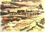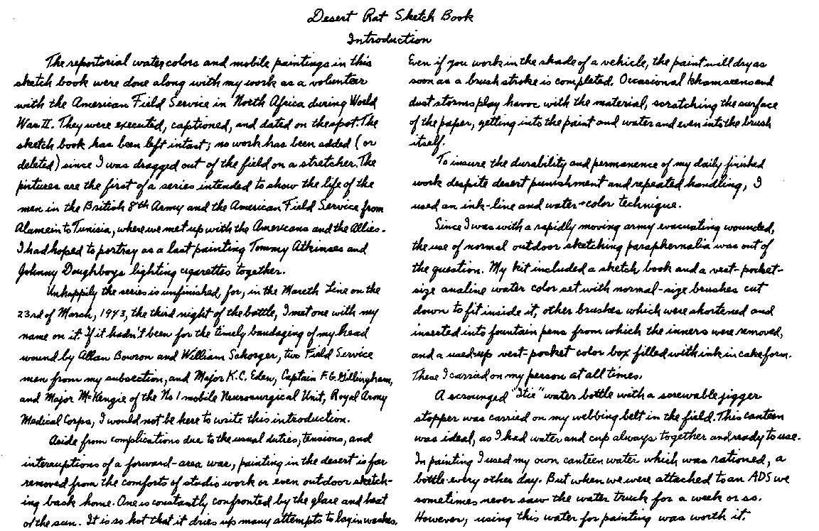 The army war-artists program had not yet been developed, but during my training period I saw the opportunities for reportorial painting. As a proving ground for the idea, I was soon executing countless portraits of draftees --- pen-and-ink as well as water-color sketches --- and these were exhibited at Atlanta, Georgia. I also developed a streamlined kit to use on maneuvers.