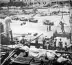 British dressing station in the desert"We drove back to the ADS just as dawn was breaking. Once again we had to fight our way past the tanks and through the narrow minefield lanes. . . . The ground was rough; we kept scraping up against the sides of the oncoming tanks, and an occasional shell landed close . . . to the track. . . . It was full daylight when we arrived at the 6th ADS. There was a great rush of work, as the casualties were pouring in from the battalions, being quickly and efficiently treated, and loaded into ambulances to be evacuated to the MDS. Scotty Gilmore's boys . . . were busy shuttling back and forth between stations with good routine efficiency. I stopped long enough to find out that the night attack had been a complete success for the 6th Brigade, which had managed to take all objectives right on schedule. Then I drove over to the 5th ADS . . . [and] Bill Nichols' section. . . . Since there was a shortage of ambulances at both the ADSs, I went back to the MDS and split up Chuck Larrowe's section, assigning 2 cars to the 5th ADS and 3 to the 6th. . . .