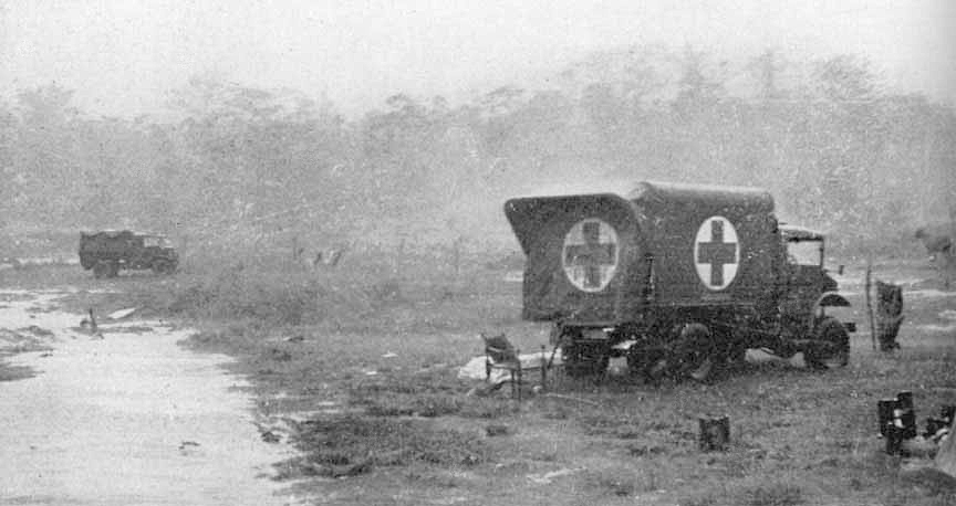 The jeeps, most of which were not new anyway, rapidly went to pot. Some evacuations had to be made at an average speed of 2 mph, at which pace they soon began to "throw oil, carbonize their spark plugs, and ruin their clutches." Replacements were needed and, miraculously, obtained. Distributing the new jeeps added more shifts of personnel and posts to those already occasioned by the advance of the troops and regular trips to workshops. To keep track of this movement, Lts. Birkett and Spavin toured steadily up and down the wretched roads, at the same time distributing mail, candy, and liquor.