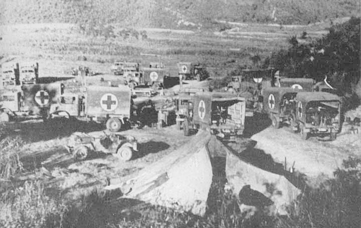 In the following days, more jeeps were acquired, and under Gilliam's direction all forward work was done by them. During daylight he remained on the road at forward positions to pick up occasional casualties and to notify the ambulances back at the ADS, under S.M. White, when they were needed forward. The road---as well as the hills known as Malta, the Pimple, and Gibraltar---was usually under shellfire from the enemy, and there were repeated attacks on the hills. At least 4 companies of infantry were fighting on this most forward range. They had precious little in the way of facilities for caring for the wounded, either supplies or personnel. Gilliam, with J. A. Miller, N. C. Kunkel, F. M. Mayfield, Jr., H. Swensson, A. J. Roach, and D. J. Bragg, undertook to supply their needs.