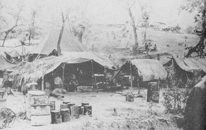 Encampment near the Chindwin, 3 MAS"Actually, there has not been too much danger except from Jap patrols and pro-Japanese Burmese left behind. But it is very hard work under appalling conditions. . . . There are words in the English language to explain a person being tired, wet, and hungry---but it simply has to be lived to be realized. As tough as the Japs are, they could not stand it. A great number of their casualties were due to starvation and disease. There is hardly a basha or covered area along the road that does not contain Jap bodies. Their hospitals are littered with dead. . . .
