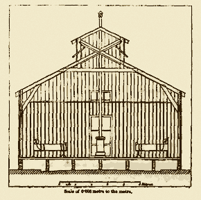 According to a circular-order issued by the United States War Department,(168) the unitary building, or ward-pavilion, should be 187 feet long, 24 feet wide, and 14 feet high, from the floor to the eaves---the pitch of the roof varying according to the materials composing it. At each extremity, two small rooms were to be partitioned off---those at one extremity to be used as a bathroom and water closet, those at the other, as a medicine closet and nurse room. The intermediate space---165 feet long---was to be occupied by beds, 30 being placed on each side of the room. About 1,000 cubic feet of space were thus allowed to each patient. The pavilion was entered by four doors, one at each extremity, and one in the middle of each side; it was lighted by 36 windows, 16 being on each side. The ventilation of the ward was also intended to be partially obtained by means of the doors and windows, especially by the windows, which faced each other, and could be let down at the top. Ventilation was, however, principally effected, in the summer, through an open ridge, protected by a false roof or lantern. In the winter, the extraction of air was accomplished by means of four cheminées d'appel---shafts---heated each by a stove pipe. Each of the stoves (four in number), surrounded by a perforated metallic jacket, was placed over the opening of an air-box, which was intended to furnish a supply of fresh air. The order directed, that the floor of the ward be at least 18 inches from the ground, with an open and free passage for the air beneath it.