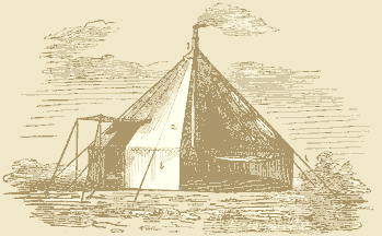 Captain Galton, in speaking of this tent, says:---"It is so peculiarly objectionable, as to make it a matter of surprise that it was ever invented and used. It is difficult to pitch, it requires many tent-pegs, it has ropes radiating all around it, over which men and horses stumble, and it is incommodious and ugly."(230) The regulation bell-tent has been the subject of various modifications, the most important of which has been an addition to the height of the perpendicular walls. The interior of the tent is thus made more convenient, and as the sides can be looped up, the tent is much better fitted for service in tropical climates.